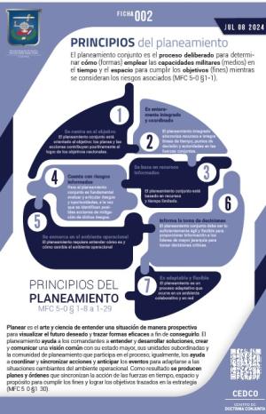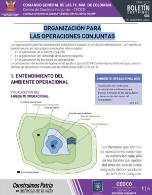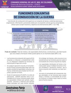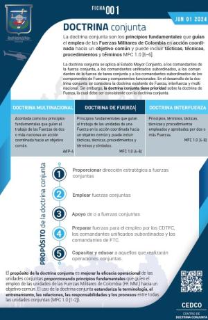 Esta colección busca difundir el trabajo del Centro de Doctrina Conjunta (CEDCO), encargado de generar y actualizar la Doctrina Conjunta de las Fuerzas Militares de Colombia, con el fin de proyectar las instituciones militares hacia escenarios internacionales para el desarrollo de misiones conjuntas y multinacionales. Su principal objetivo es establecer la Doctrina para las unidades conjuntas de las Fuerzas Militares, optimizando su operatividad para obtener excelentes resultados, contribuyendo así al mejoramiento de la calidad de vida de los colombianos para una paz estable y duradera.